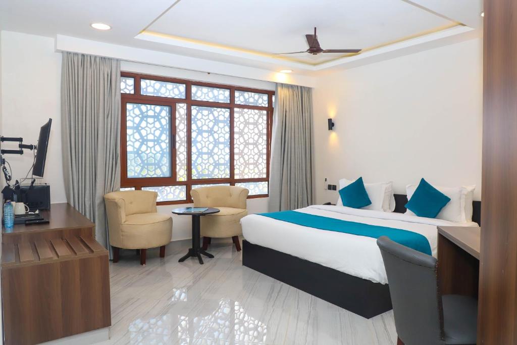 A spacious room with King Size Bed, 4 Seater Sofa Set, large ergonomic work area, LCD TV, Free internet access, broadband connection, tea/coffee. Maximum 2 Adults. A private bathroom with a walk-in shower, kettle, a microwave and a mini fridge.