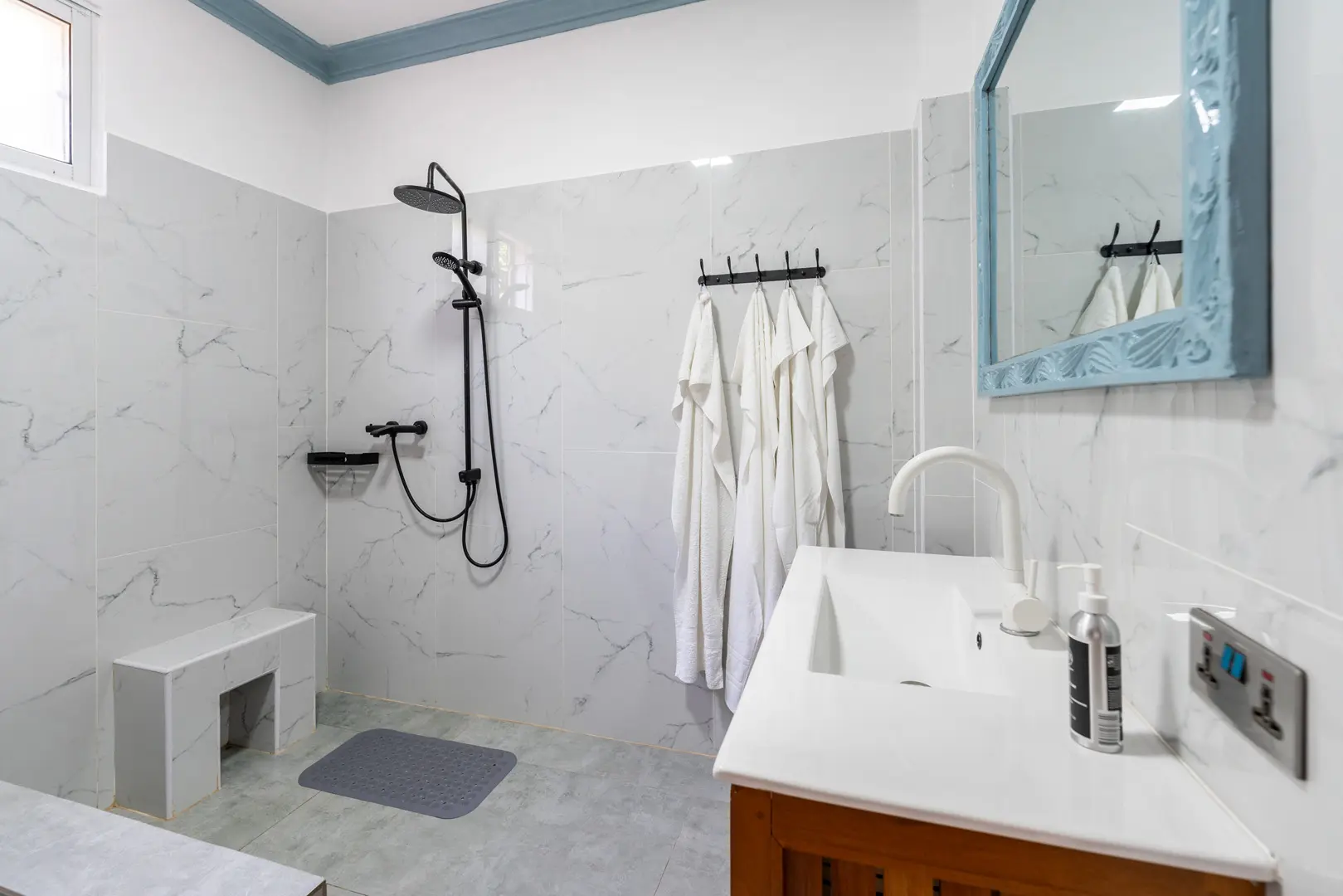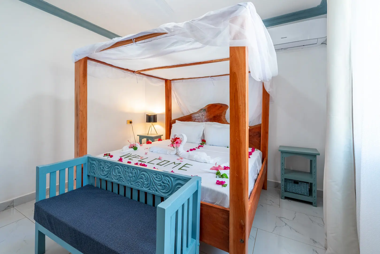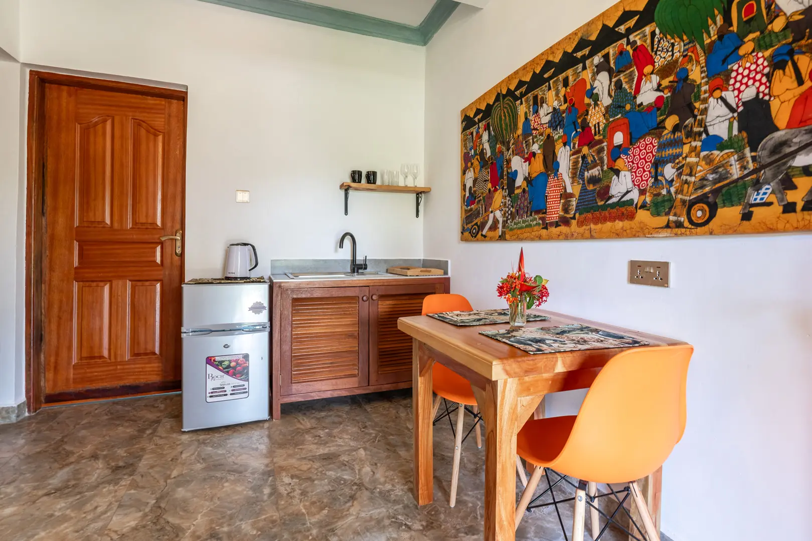 Babylon Gardens is a newly built resort in the heart of Diani Beach, Kenya. Eight spacious one bedroom villas spread out on a 4,000 sqm compound. Each villa has a porch, a sitting room with two sofas, large 43″ smart TV, a tea kitchen (kettle and fridge/freezer) and dining for two. The bedroom has a king size bed with high quality mattress, open wardrobes and air conditioner. The barrier-free bathroom has a walk-in shower. Babylon Gardens is suitable for singles and couples but not for kids under 12.
